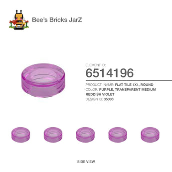 FLAT TILE 1X1, ROUNDCategory: Plates, Plates, Round & AnglesColour: Purple, Tr.medium Reddish VioletElement ID: 6514196Design ID: 35380