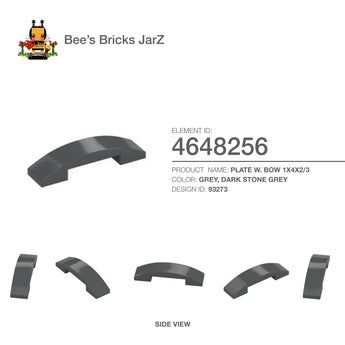 PLATE W. BOW 1X4X2/3Category: Bricks, Bricks, Bows & ArchesColour: Grey, Dark Stone GreyElement ID: 4648256Design ID: 93273