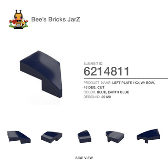 LEFT PLATE 1X2, W/ BOW, 45 DEG. CUTCategory: Bricks, Bricks, Bows & ArchesColour: Blue, Earth BlueElement ID: 6214811Design ID: 29120