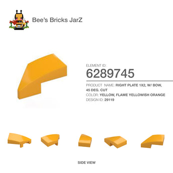 RIGHT PLATE 1X2, W/ BOW, 45 DEG. CUTCategory: Bricks, Bricks, Bows & ArchesColour: Yellow, Flame Yellowish OrangeElement ID: 6289745Design ID: 29119